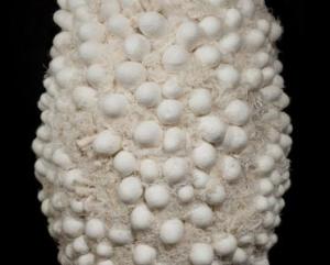 Carol Wisker is a mixed media artist who works in varying degrees of fiber, in addition to prior works where she used diverse recycled materials such as metals, mesh, clothes line and paper. Density (various mixed media, 2012) is one of her works in this exhibit that utilizes an ovoid form but devoid of any color, rather using neutral colors found in objects of nature such as silk cocoons or cotton. One could be reminded of the constructions of artist Eva Hesse (born 1936, died 1970) who essentially brought public the ideas of “cocoon-as-art”. Hesse was one of the first women artists of this century to employ unconventional materials such as Wisker is doing here. Wisker’s use of repetition and consistency of oval forms harkens back to feminist notions of artists (throughout history) constructing objects, or painting abstract pieces that seem to “auto-represent” the female form.