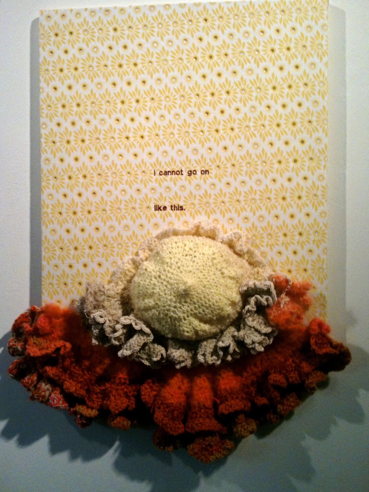 Maddonni Haims’ Purge series showcases several pieces hung relief-style from the gallery walls, such as I cannot go on like this (Vintage fabric, embroidery, hyperbolic crochet, 2012). Even though there are several longer, dramatic “epic” wall pieces, this is the one that is screaming to be touched (though I dare not) due to the soft-looking, attractive qualities of the Maddonni Haims-style “yarn cascades” that buttress the base of this relief, in a style known as “hyperbolic crochet”. Contrasting to that soft cascade is the embroidered text statement of the work’s title – reminiscent of conceptual artist Jenny Holzer (b.1950) in her very famous outdoor pieces that used text as image but on a grandiose scale of a highway billboard or her L.E.D. signs of projected text.