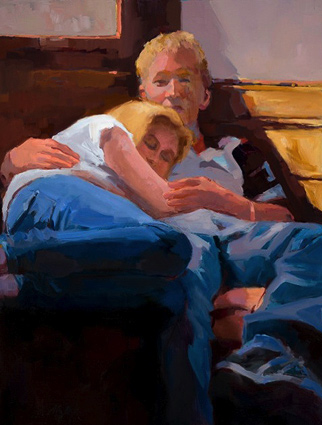 Painter Monique Lazard uses the oil painting medium in a interpretive, visceral way to depict her figurative subjects and the emotions or complacence they may be feeling. College Visit (oil, 40″ x 30″) shows what appears to be a college-age male/female couple entwined in an embrace. The female subject’s facial expression is one of sincerest comfort, while the male subject is sitting nonchalantly gazing into space. Is he comforted by her visit? Or, one can go in many tangents with a very different narrative. Lazard aptly uses brushstrokes on the male subject’s face, on both of their denims and their hair to feed the “air of mystery” with tactfully-placed highlights vs. a lower-left darkened contrast. Additional oil paintings by Lazard seen in this exhibit, such as Homage to Gauguin and Laundry Day depict frontally-positioned female subjects – with Lazard’s brushstrokes being the most paramount item of the artist’s painterly interpretations. The play of light and varying opacities of color create the primary focal point for the viewer; it is what leads one to want to interpret each of her painting’s meanings or associations.
