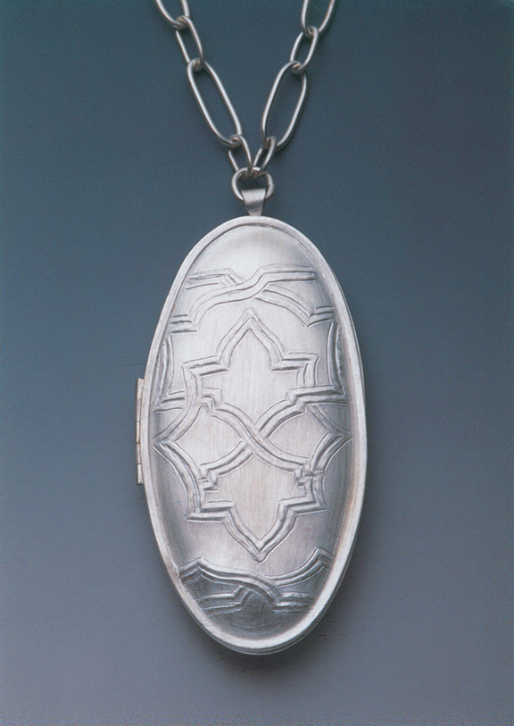 Looking through my older work, the pieces that garnered the most attention and entry to juried group shows are my lockets. These one-of-a-kind pieces evoke the decorative patterning found in objects from the decorative arts of the Renaissance period. My pieces are a commentary on images of women and the “gaze”, and how devices of jewelry containing female images from famous paintings throughout art history (such as depictions of Judith) could be seen as the consummate image of female militancy. This particular piece appropriates the image of Lucas Cranach’s Judith and Holofernes (c. 1537) manipulated to black and white. The silver is first die-formed from a hollowed-out oval die that I made in wood, fabricated in sterling silver through chasing and repoussé, then I make and solder together the longish sterling silver chain from oval links. I am on the fence about whether I wish to continue using this way of working my jewelry pieces – since I’m very pleased with the way chasing tools permit an endless display of ideas with decorative patterning in metal; however, chasing metal in silversmith’s black pitch is an extremely messy way of working, not to mention the unappealing cleanup that’s involved as I work on both sides of a jewelry piece.