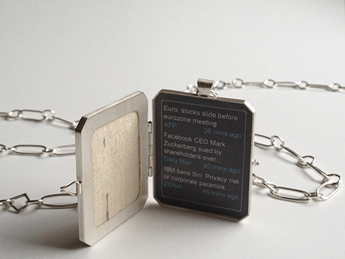 I feel extremely fortunate to be able to introduce a piece at each show from my new body of jewelry/metal work. The series is called “widget lockets” – pieces fabricated entirely by hand in sterling silver (this includes a handmade oval sterling chain, clasp, bail and constructed hinge), with the addition of mixed media such as silk, plexiglas/acrylic, graphic 2-D elements created in Adobe Illustrator, printed in color on archival paper and set inside. To give an idea of what I’m essentially trying to discuss through these pieces: just like Victorians memorialized their loved ones in the historic pieces known as “mourning jewelry” – these lockets are an homage to a “dying” or near-outdated technology, such as lockets that incorporate news streams or short snippets of current headlines that scroll across computer screens/monitors.Patricia Sullivan: “Widget Locket” (rear detail), fabricated sterling silver, 2012. At first glance when the lockets are viewed from the front, back or closed, the object appears to be a precious item made from a precious metal and covered in silk, so as to fool one into thinking it is merely a highly personal, beautiful object. But upon opening the locket – one reveals to the viewer an unexpected screen snapshot of stories that parlay technology and how this technology has begun to consume our personal lives and wants. The text is appropriated from current news articles of importance from recent months; every aspect of this 2-D element was created by hand, including the typed-out sentences and P. Sullivan: “Widget Locket” (inside detail), 2012.chosen typeface.