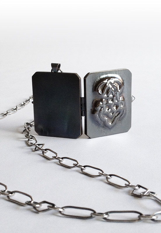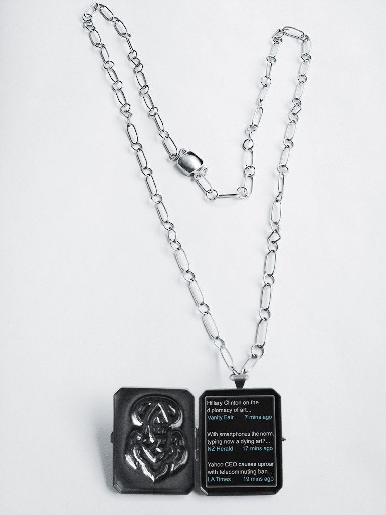 Using motifs from the history of decorative arts, I chose to return to using chasing and repoussé in sterling silver. I incorporate a completely handmade sterling chain, clasp and hinge, referring back to the Victorian practice of placing meaningful items into a locket as a “homage” to loved ones. However, despite the Art Nouveau-styled undulating curves of the chased cover, I’m picturing the modern-day version of this wearer to be reading and receiving news from digital sources via smart phones and computer widgets.