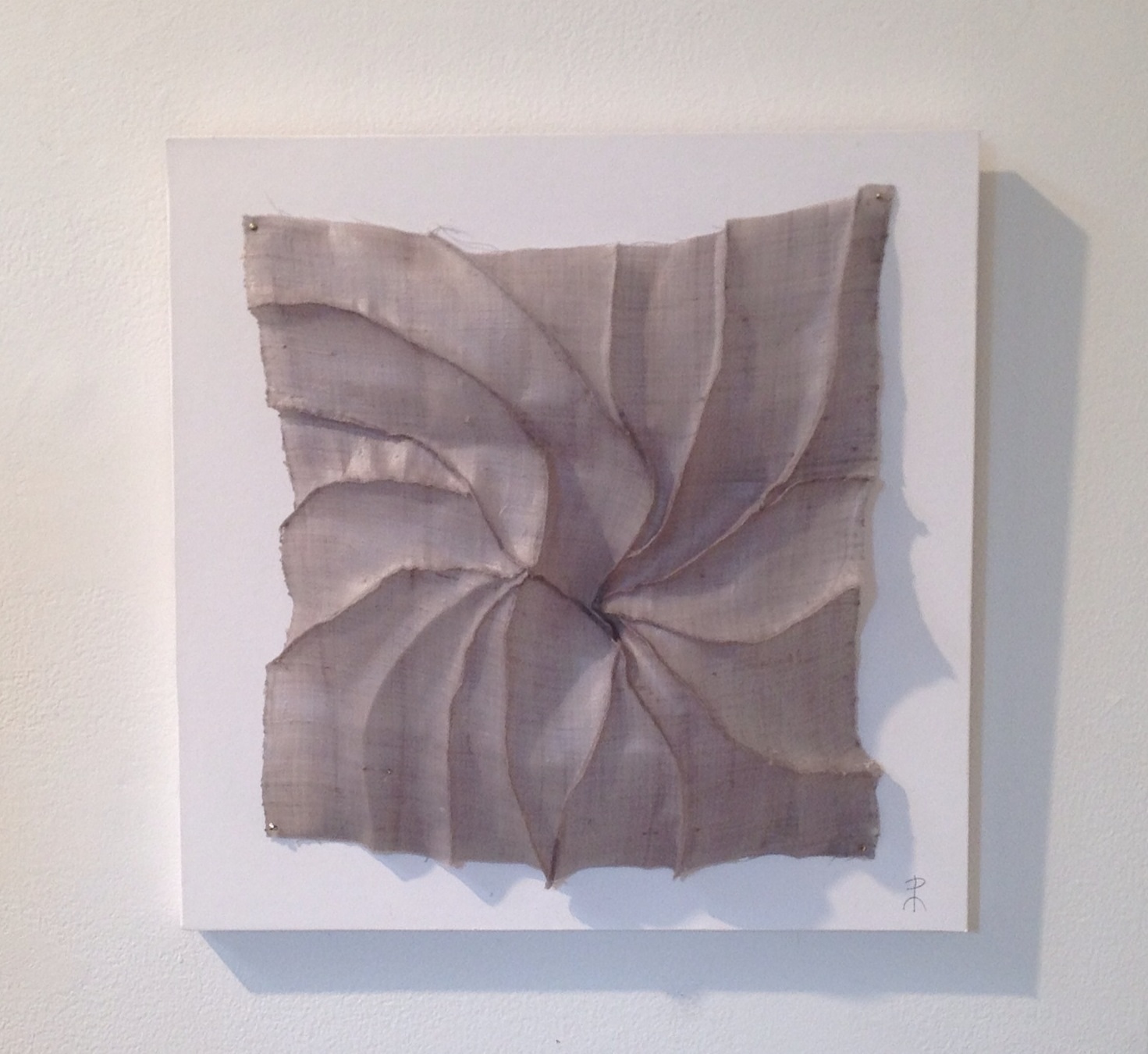 Patricia Malarcher: “Cloud” (installation view). Fabric, encaustic, mounted on white board, 14″x14″x1.5″, 2013. Photo: P. SullivanPatricia Malarcher’s Cloud is a gorgeous fiber piece that uses encaustic to enhance and create waves of unequal origin around a center matrix of sewn fabric. The entire piece’s monochromatic tonality makes one feel as though he/she is looking at a sort of celestial “cloud” or falling star. The ridges that Malarcher draws with her needle and thread create a pinwheel effect that one can imagine if this object were to be floating through a sky, it would be a surviving entity due to its strong interior core of wax over fiber. Incidentally, Malarcher was the editor for nearly twenty years of the prestigious and widely-regarded Surface Design Journal. This publication of the Surface Design Association features articles that focus on contemporary textile and fiber-based art forms.