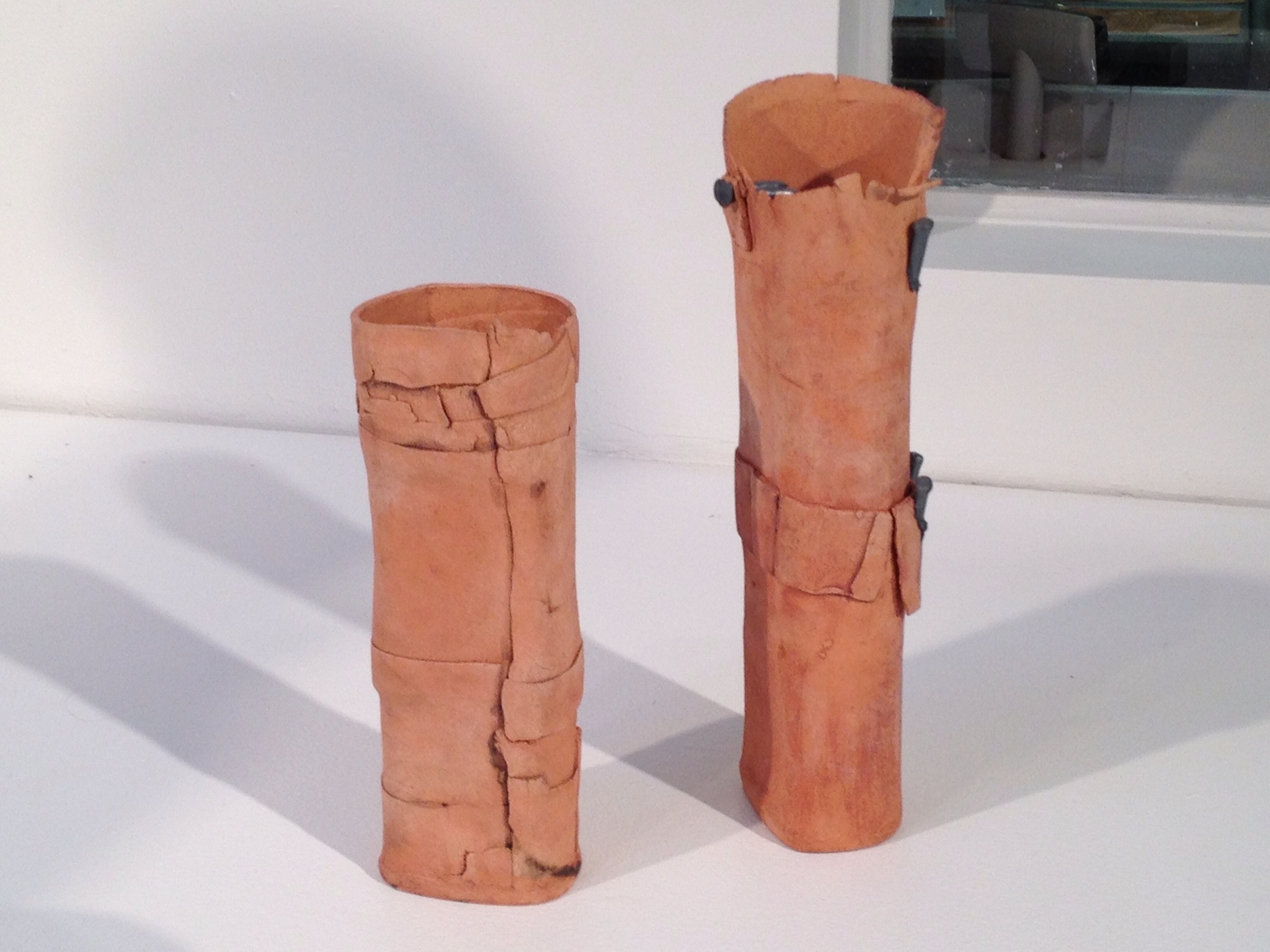 Risa Hirsch Ehrlich: “Two Vases Alike” (installation view). Ceramic, metal elements, 13″x4″x3″, 2011. Photo: P. SullivanCeramic artist Risa Hirsch Ehrlich is a prolific clay artist who lives and maintains her studio in New York City. Two Vases Alike is a sculptural clay work that serves a bi-purpose of being functional vases. Two columns appear elegantly side-by-side, wrapped like fabric and imply that they are actually fired clay slabs that are secured by dark patinated metal clips. One imagines architectural columns that have been worn by the elements throughout history, with its subtle areas of color change along the surfaces. Risa in her artist statement embraces the various ways the beauty of her pieces come about: “I like clay beginning frail and ending powerful. I like challenging clay to be beautiful despite my efforts to disdain beauty.”