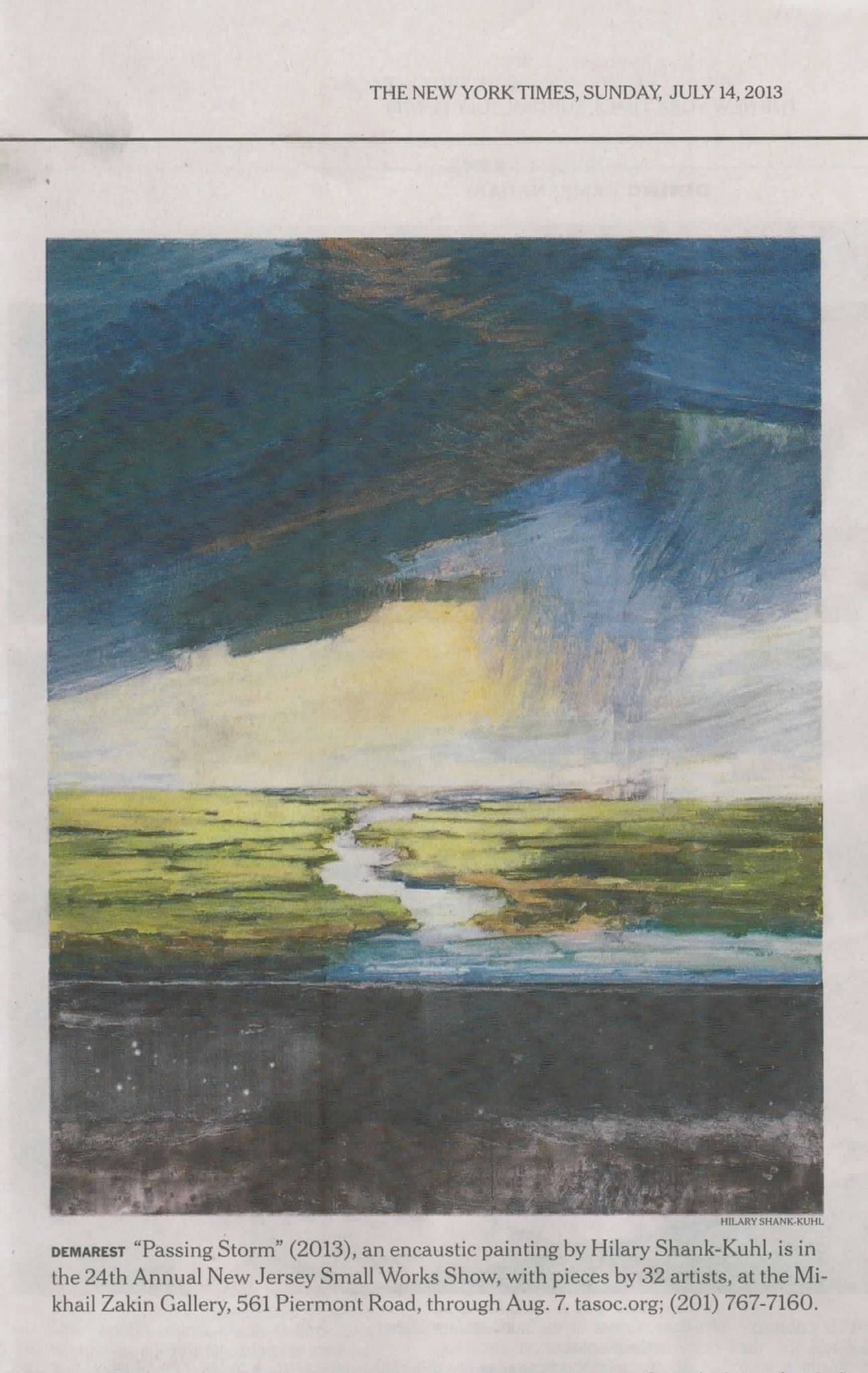 Hilary Shank-Kuhl, “Passing Storm”. (NY Times Metro section, July 2013.) Encaustic painting, 2013.Painter Hilary Shank-Kuhl’s encaustic painting Passing Storm is a haunting landscape of magnificent depth despite its small-scale canvas. This work was chosen by The New York Times’ Metro section as the pictorial announcement to this NJ Small Works exhibit. Kuhl has a masterful sense of hatching lines as she draws vividly through the wax pigments and creates a true path of movement along the waterway that allows one to believe he/she is about to move through that meandering water in the painting’s center and end up at the horizon of ominous clouds.
