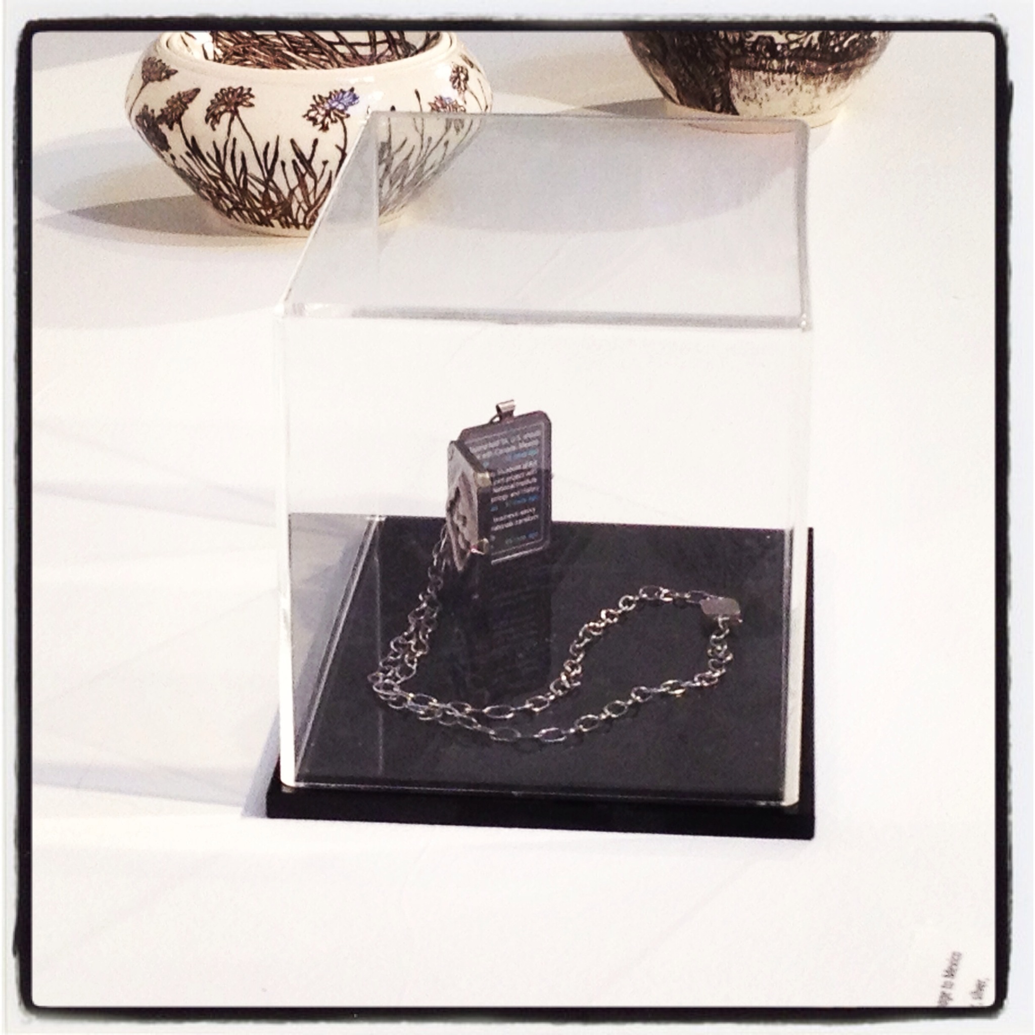Patricia Sullivan: “Widget Locket #4” (installation view). Chased and repousse copper, silver, Plexiglas, archival paper, 2013. Photo: P. SullivanMy jewelry piece, Widget Locket #4: Homage to Mexico debuted in this exhibit. As discussed in a prior post, my locket uses motifs derived from the history of Mexico’s decorative arts with text snippets taken from the headlines one reads on scrolling computer widgets and smart phones. Using this Widget Locket as an example, Gallery Director John J. McGurk set up/installed this show in such a highly professional manner with such refined sensibilities as one can readily see in his meticulous approach to the display of both fine craft and painterly/2-D media.