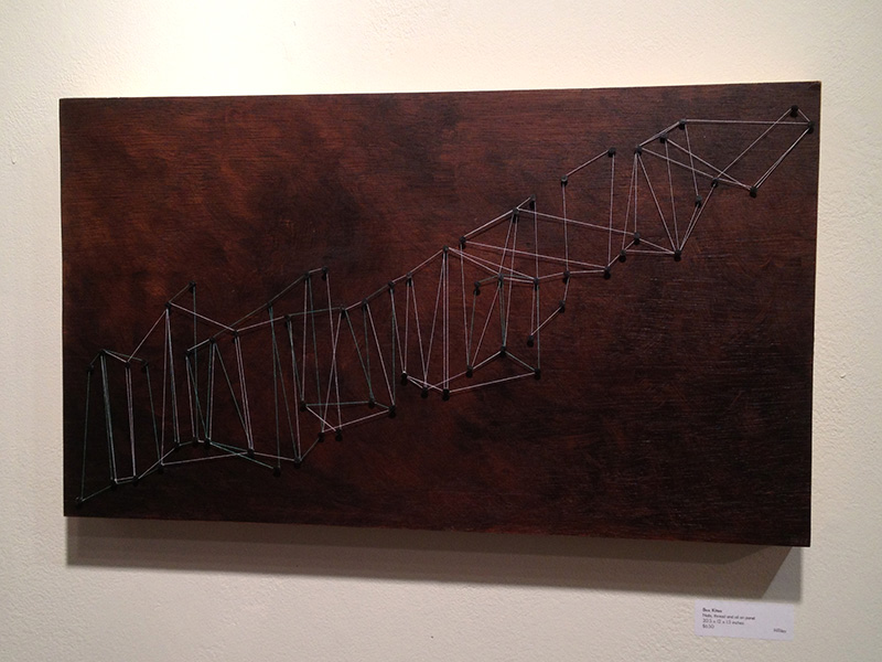 Heather Riley: “Box Kites” (installation view). Nails, thread, oil on panel, 20.5″x 12″x 1.5″, 2013. Photo: P.SullivanThe artist exhibited several new works on panel that use materials found in craft (such as fiber arts) more often than in strict oil painting. Box Kites is a medium-sized wall piece that manipulates the angular geometry of a flying kite form into parallelograms and triangles of white and green thread. The warm furniture-like brown hues of the oil-painted backdrop seem to mimic clouds with an economy of color that is so masterful – one may think the sky is supposed to be this warm-brown in nature all the time, as opposed to being “light-filled” with sky-blue tonality. Add into this mix the circular dotting of nails holding this threaded composition into place, and one may think he/she is actually looking at an updated Barnett Newman composition or a painterly abstraction reminiscent of the abstract expressionist era.