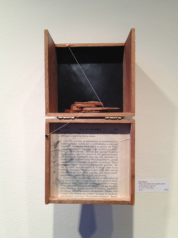 Heather Riley, “From Above” (installation view). Wood, nails, thread, conte, graphite, paper, acrylic, oil, cigar box, 4″x 5.5″x 4.25″, 2013. Photo: P. SullivanThe multiple combination of materials Riley employs in her construction piece From Above weaves a narrative that the viewer may spend a long time deciphering. A found wooden cigar box complete with brass hinges and a page of text from Herbert Spencer’sTrial and Compromise: The Principles of Ethics is artfully crafted into an assemblage that also features slivers of wood such as those found in a natural outdoor landscape. These slivers are pierced tightly with delicate thread, placed against the harsh blackened darkness of the box’s graphite-filled interior. Is the delicate white thread symbolic of a greater effort to unify the ideals and paper text of Spencer to the natural outside world and this pictorial of wooden yet dark landscape of earth in which we may live? Possibly the two halves of this cigar box construction reflect the dichotomy that makes up a human’s existence: the intellectual realm of thought versus the reality of the natural world.