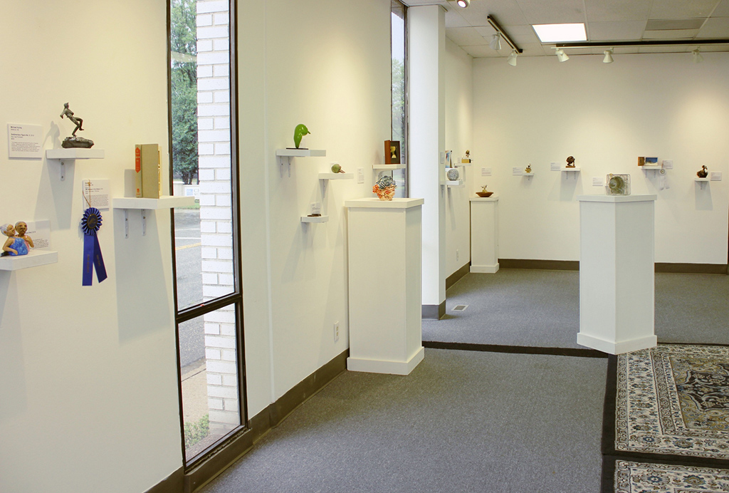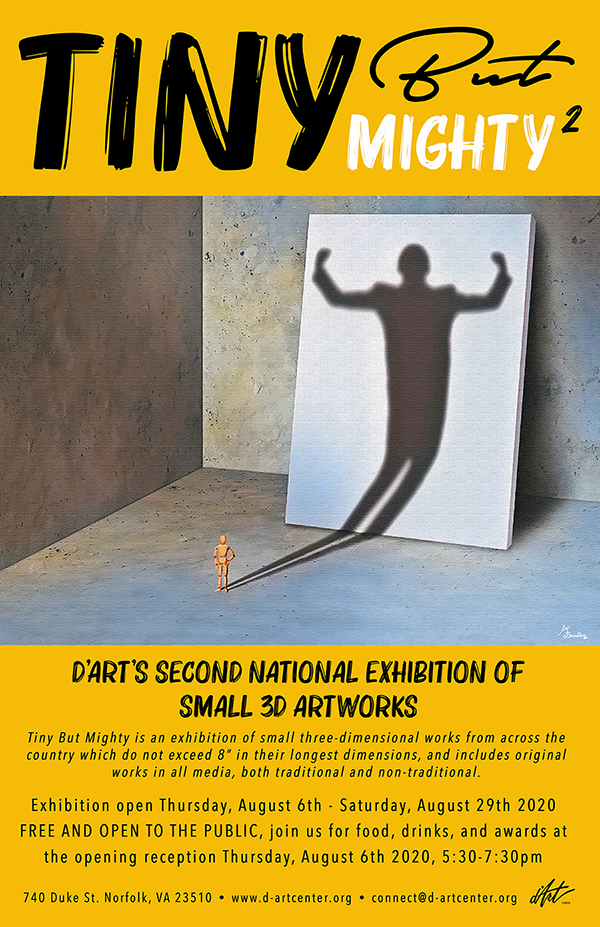 Exhibition postcard and invite for d’Art Center’s second Tiny But Mighty 3-D national exhibit, 2020. Graphic Design by Amanda Bradley.Last Thursday evening, the d’Art Center located in the NEON district of Norfolk, Virginia opened its second national juried Tiny But Mighty II exhibition of small three-dimensional works from across the U.S. that do not exceed 8” in their longest dimensions. Arts educator and Virginia-based freelance writer Betsy DiJulio and d’Art Center’s gallery manager Amanda Bradley selected fifty-five pieces from forty-eight artists across thirty-seven different states. The parameters of this exhibit includes both freestanding and wall-mounted 3-D works that must be three-dimensional in at least 50% of its form and structure. Despite delays and the added restrictions of viewing artwork in-person amidst the COVID-19 pandemic, the gallery at d’Art Center beautifully installed the show and held its opening reception last week. Virginia state-mandated rules require attending artists and visitors to adhere to social distancing and wear facemask coverings while inside the gallery.